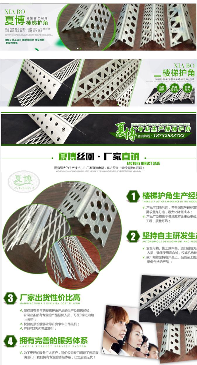 (1)尺寸:樓梯護(hù)角網(wǎng)是成長(zhǎng)條形的護(hù)角,一邊是寬30、50、70mm。