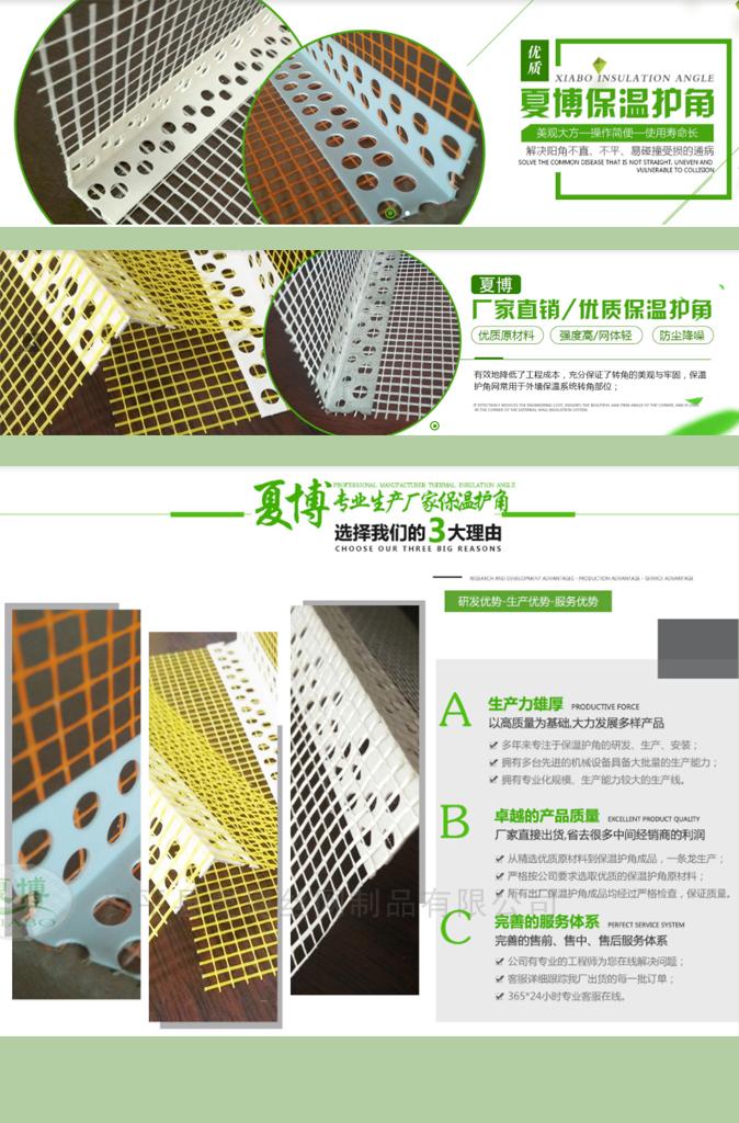 夏博公司業(yè)務(wù)員經(jīng)常有客戶打電話來詢問護(hù)角網(wǎng)上的網(wǎng)格布能不能粘在pvc護(hù)角網(wǎng)的內(nèi)側(cè),從生產(chǎn)工藝上來說是完全可以的,但是從施工方面來說是不行的,大家想一下,如果網(wǎng)格布在產(chǎn)品的外側(cè),受到外界撞擊時(shí)護(hù)角條先受到,時(shí)間一長保溫層就會(huì),網(wǎng)格布時(shí)間長了也會(huì)受到撞擊而受損。但是如果網(wǎng)格布在外側(cè),外面的網(wǎng)格布受到,里面的護(hù)角條還會(huì)保護(hù)墻角。